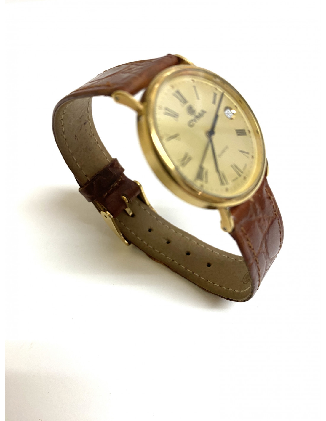Reloj Oro Cyma Cuarzo en oro de 18 kilates con calendario. Medida:31mm. Correa de piel.