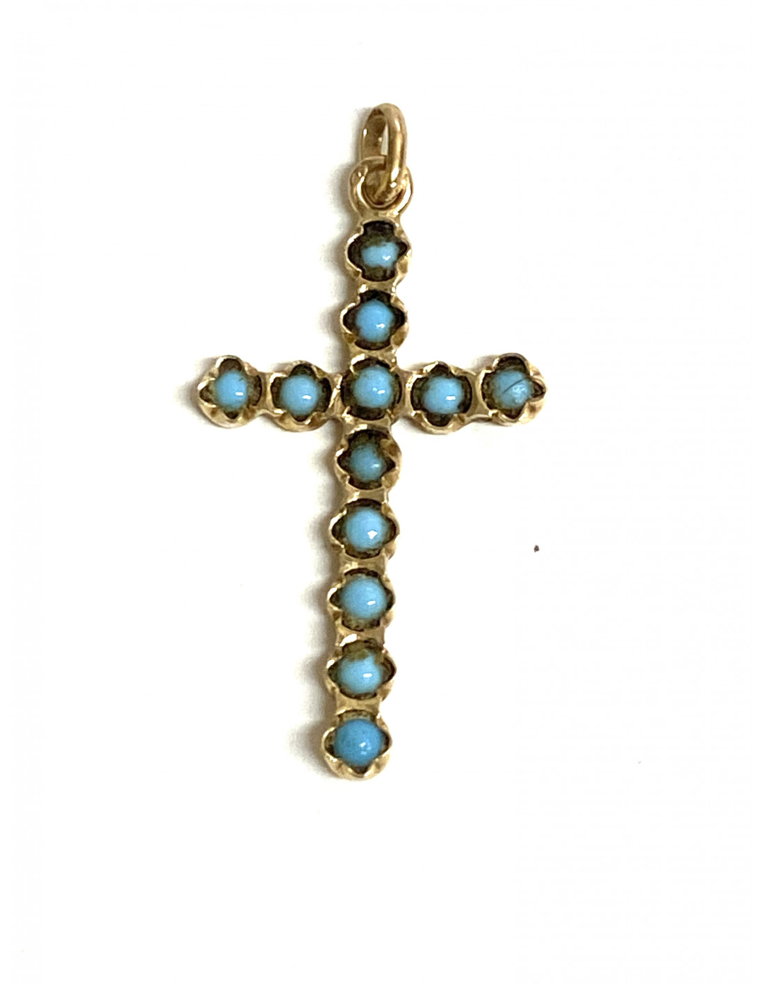 Cruz en oro y turquesa. Peso aprox.0,85g  Medida:30x14,5mm