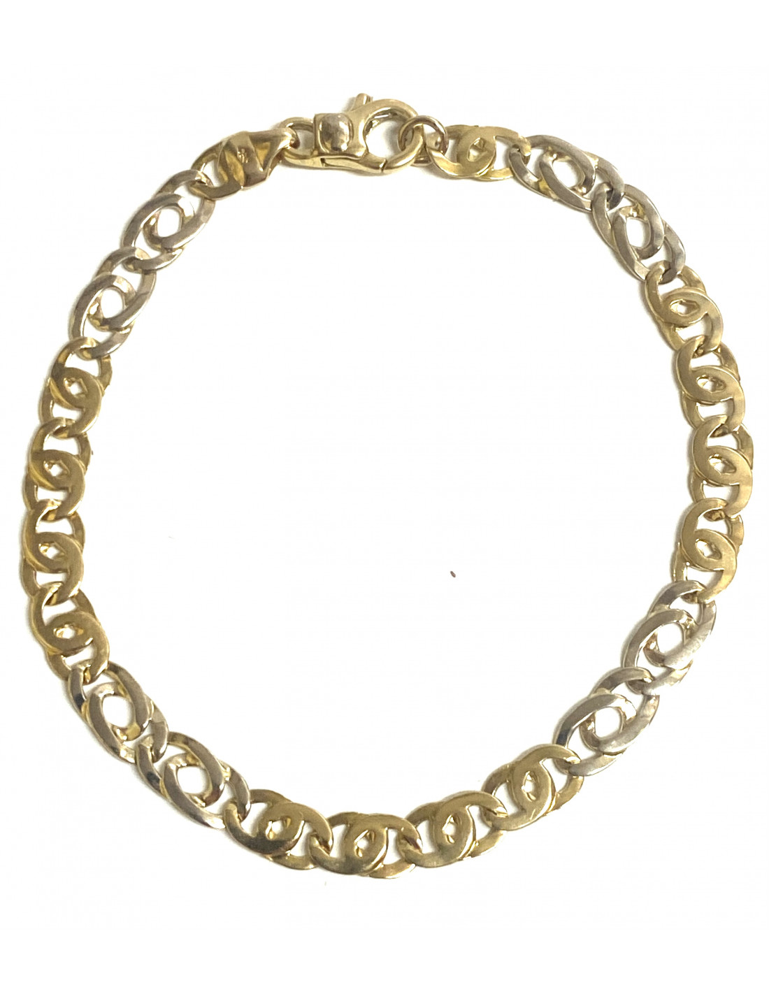 Peso aprox: 6,99 gr. Pulsera fabricada en oro amarillo de 1ª Ley 18 kilates (750 milésimas). Pulsera con cadena barbada de eslabones huecos. Mide 19 cm de longitud, 5 mm de ancho y tiene cierre de mosquetón.