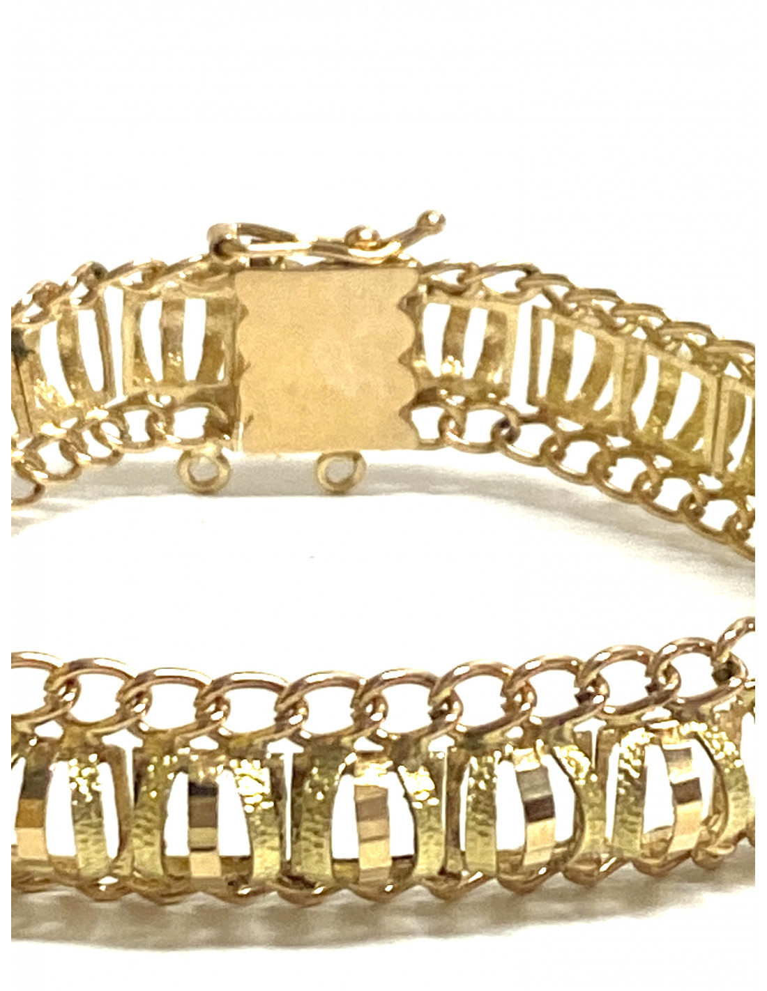 Peso Aprox: 20,40 gr. Pulsera de mujer fabricada en oro amarillo de 18 kilates. Pulsera tipo princesa tallada de acabado pulido y matizado con un ancho de 12 mm. Mide 18 cm. Cierre de caja. Con Cadena de seguridad.